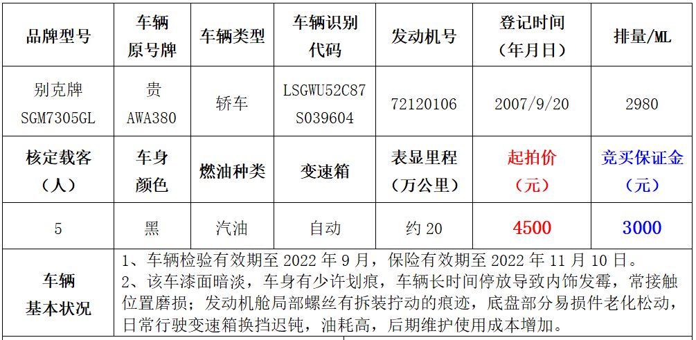 拍品編號(hào)1:別克牌SGM7305GL轎車(chē)一輛