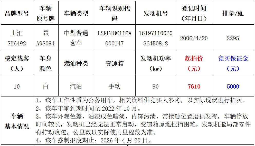 拍品編號(hào)2:上匯SH6492中型普通客車(chē)一輛