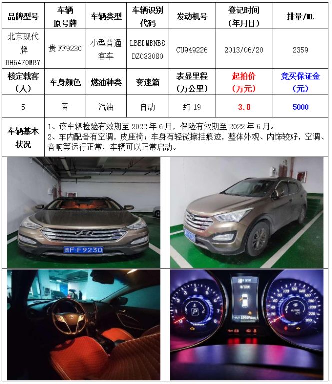 拍品編號(hào)2:北京現(xiàn)代牌BH6470MBY小型普通客車一輛