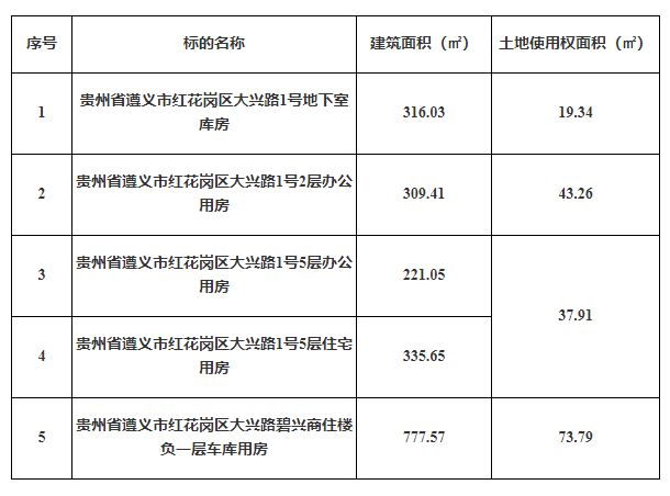 2、貴州省遵義市紅花崗區(qū)大興路1號地下室?guī)旆浚偨ㄖ娣e:316.03㎡);貴州省遵義市紅花崗區(qū)大興路1號2層辦公用房(總建筑面積:309.41㎡);貴州省遵義市紅花崗區(qū)大興路1號5層辦公用房(總建筑面積:221.05㎡);貴州省遵義市紅花崗區(qū)大興路1號5層住宅用房(總建筑面積:335.65㎡);貴州省遵義市紅花崗區(qū)大興路碧興商住樓負一層車庫用房(總建筑面積:777.57㎡)。