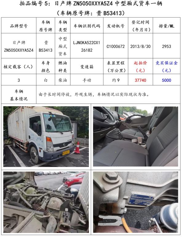 拍品編號5:日產(chǎn)牌ZN5050XXYA5Z4中型廂式貨車一輛(車輛原號牌:貴B53413);