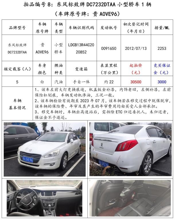 拍品編號8:東風(fēng)標(biāo)致牌DC7232DTAA小型轎車1輛(車牌原號牌:貴A0VE96);