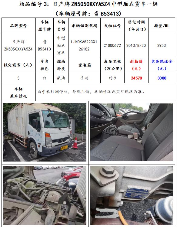 拍品編號3:日產(chǎn)牌ZN5050XXYA5Z4中型廂式貨車一輛(車輛原號牌:貴B53413);
