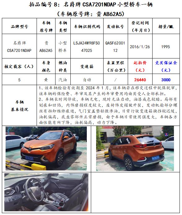 拍品編號8:名爵牌CSA7201NDAP小型轎車一輛(車輛原號牌:貴AB62A5);