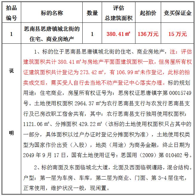 1、思南縣思唐鎮(zhèn)城北街的住宅、商業(yè)房地產(chǎn),建筑面積共:380.41㎡;起拍價(jià):136萬元;競買保證金15萬元。