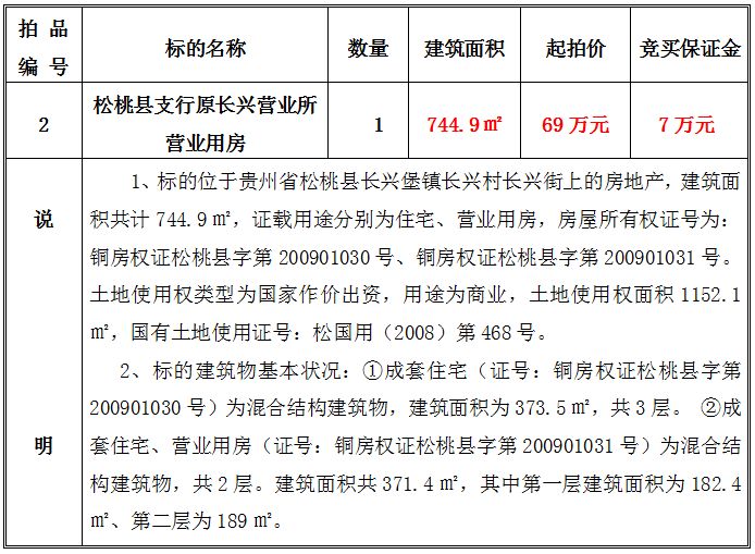 2、松桃縣支行原長興營業(yè)所營業(yè)用房,建筑面積共:744.9㎡;起拍價(jià):69萬元;競買保證金:7萬元