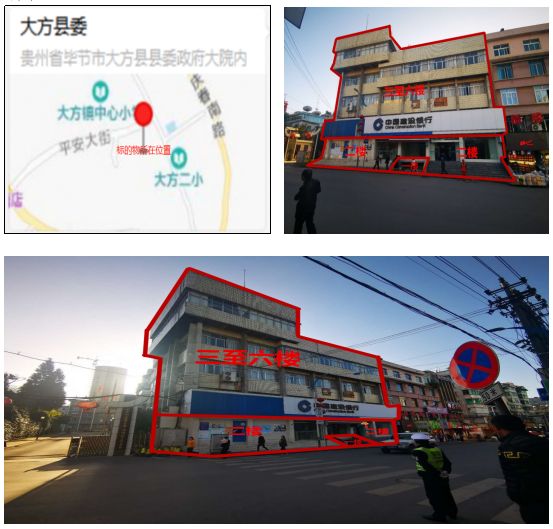 標的物位于畢節(jié)市大方縣大方鎮(zhèn)南街1層至6層,總建筑面積:1479.43㎡,其中:1層建筑面積為222.97㎡,2層建筑面積為284.43㎡,3至6層建筑面積為972.03㎡,房屋所有權(quán)證號:方房權(quán)證2005字第370609722號;用地面積:267.84㎡;建筑結(jié)構(gòu):混合結(jié)構(gòu);用途:辦公用地;總樓層:共6層;使用權(quán)類型:出讓;土地終止日期:2035年8月。