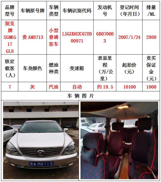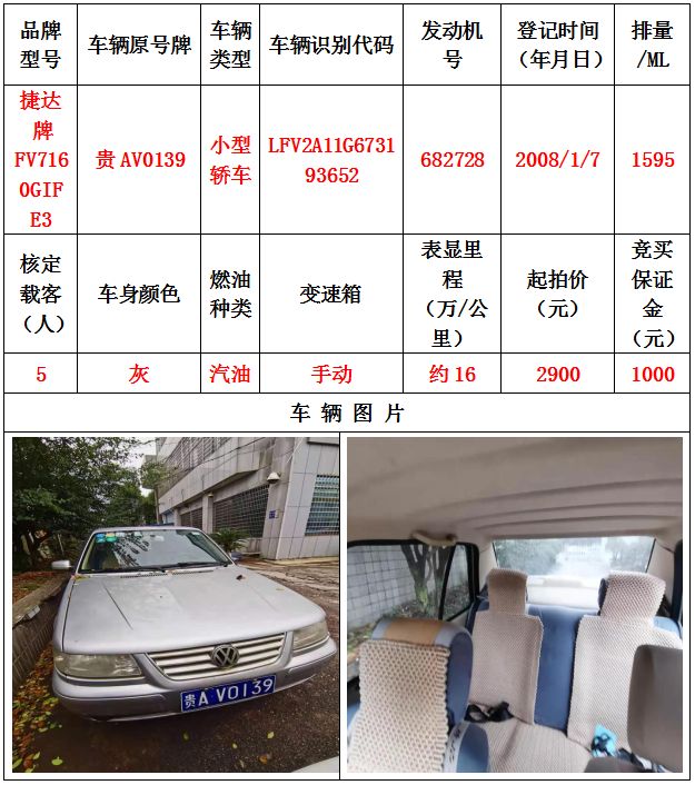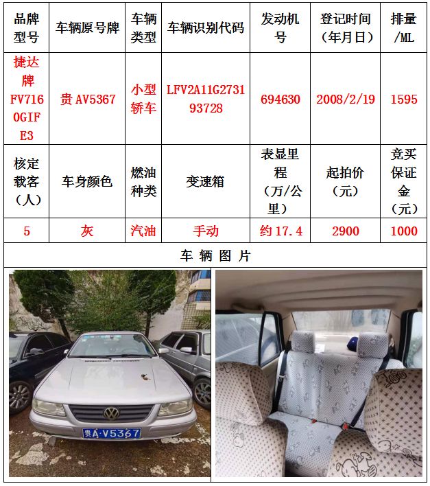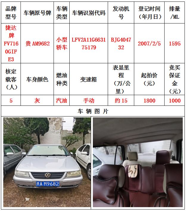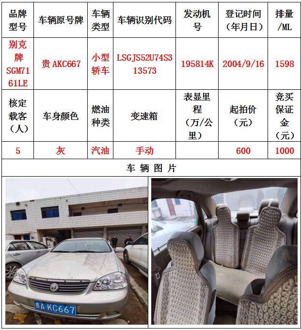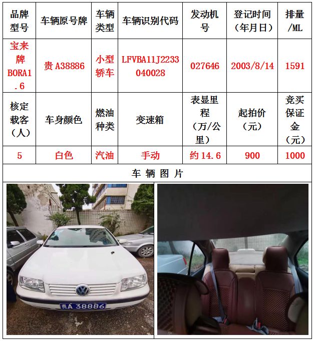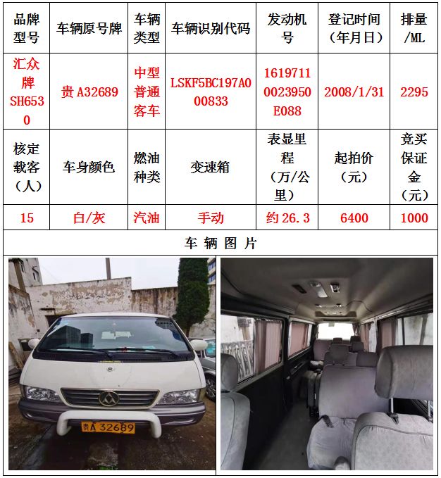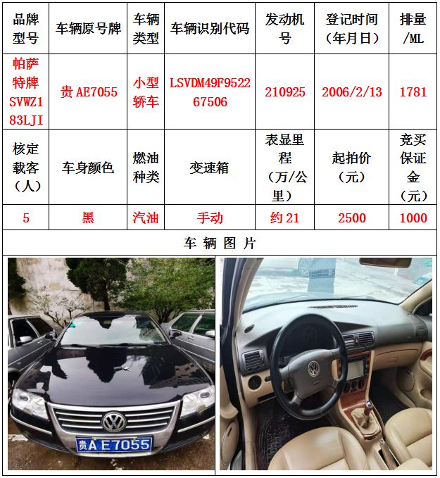 本次拍賣會拍賣的車輛共計10輛車,分別為帕薩特牌SVWZ183LJI小型轎車一輛、匯眾牌SH6530中型普通客車一輛、別克牌SGM6517小型普通客車一輛、別克牌SGM7161LE小型轎車一輛、寶來牌BORA1.6小型轎車一輛、捷達牌FV7160GiFE3小型轎車五輛(詳情見下文),為打包整體拍賣,不作拆分,整體起拍價:33900元,且只對標的現狀進行拍賣,不作任何質量擔保。