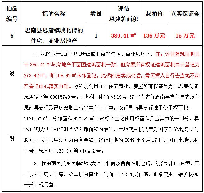 2、思南縣思唐鎮(zhèn)城北街的住宅、商業(yè)房地產,建筑面積共:380.41㎡;起拍價:136萬元;競買保證金15萬元。