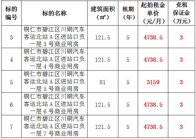 3、銅仁市碧江區(qū)川硐汽車客運(yùn)北站A區(qū)進(jìn)站口負(fù)一層3號門面,面積:121.5㎡,租賃期:5年,起拍租金:4738.5元/月,競租保證金:3萬元;