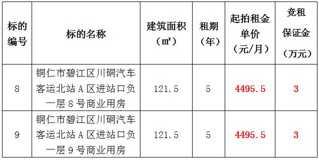 8、銅仁市碧江區(qū)川硐汽車客運(yùn)北站A區(qū)進(jìn)站口負(fù)一層8號門面,面積:121.5㎡,租賃期:5年,起拍租金:4495.5元/月,競租保證金:3萬元;