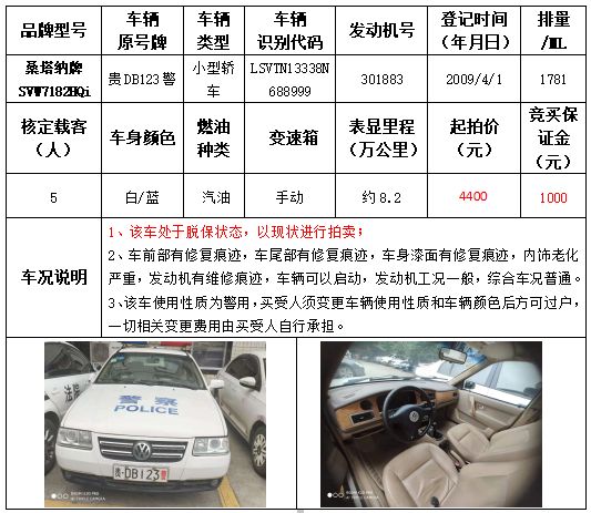 拍品編號(hào)13:桑塔納牌SVW7182HQi小型轎車一輛