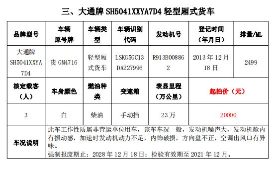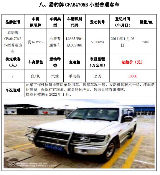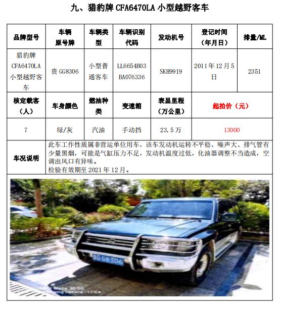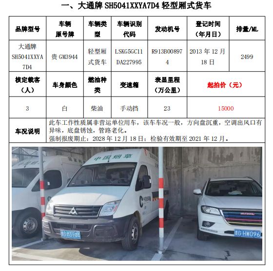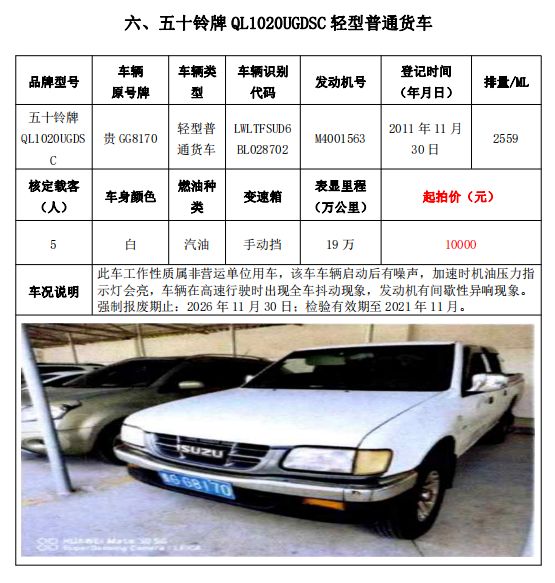 大通牌SH5041XXYA7D4輕型廂式貨車2輛、大通牌SH5041XXYA6D4輕型廂式貨車1輛、江鈴全順牌JX5047XXYDLA2-H輕型廂式貨車2輛、江鈴全順牌JX5047XFWMD小型專項作業(yè)車1輛、五十鈴牌QL1020UGDSC輕型普通貨車1輛、獵豹牌CFA6470M3小型普通客車1輛、獵豹牌CFA6470LA小型越野客車1輛,共計9輛車整體拍賣。