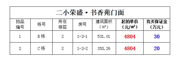 二小榮盛·書香苑門面2間,建筑面積:353.26—531.01㎡,起拍單價:4804元/㎡;