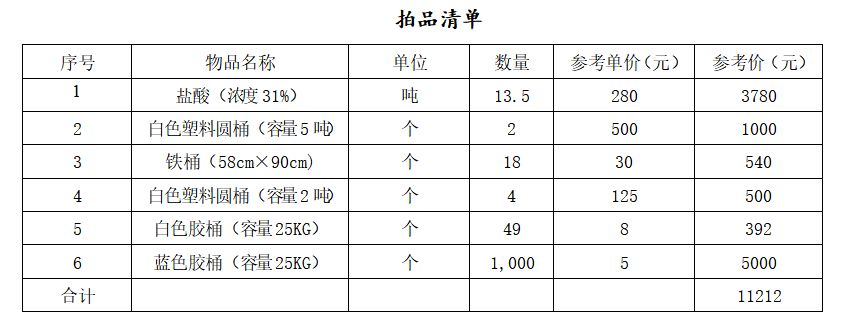 該批標的為整體拍賣,鹽酸是氯化氫(HCl)的水溶液[2],屬于一元無機強酸,工業(yè)用途廣泛。鹽酸的性狀為無色透明的液體,有強烈的刺鼻氣味,具有較高的腐蝕性??捎糜诜治龌瘜W、酸洗鋼材、制有機化合物、制無機化合物、控制pH等。