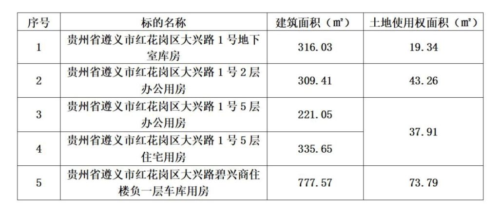 1、貴州省遵義市紅花崗區(qū)大興路1號地下室?guī)旆浚偨ㄖ娣e:316.03㎡);貴州省遵義市紅花崗區(qū)大興路1號2層辦公用房(總建筑面積:309.41㎡);貴州省遵義市紅花崗區(qū)大興路1號5層辦公用房(總建筑面積:221.05㎡);貴州省遵義市紅花崗區(qū)大興路1號5層住宅用房(總建筑面積:335.65㎡);貴州省遵義市紅花崗區(qū)大興路碧興商住樓負一層車庫用房(總建筑面積:777.57㎡)。(整體拍賣)