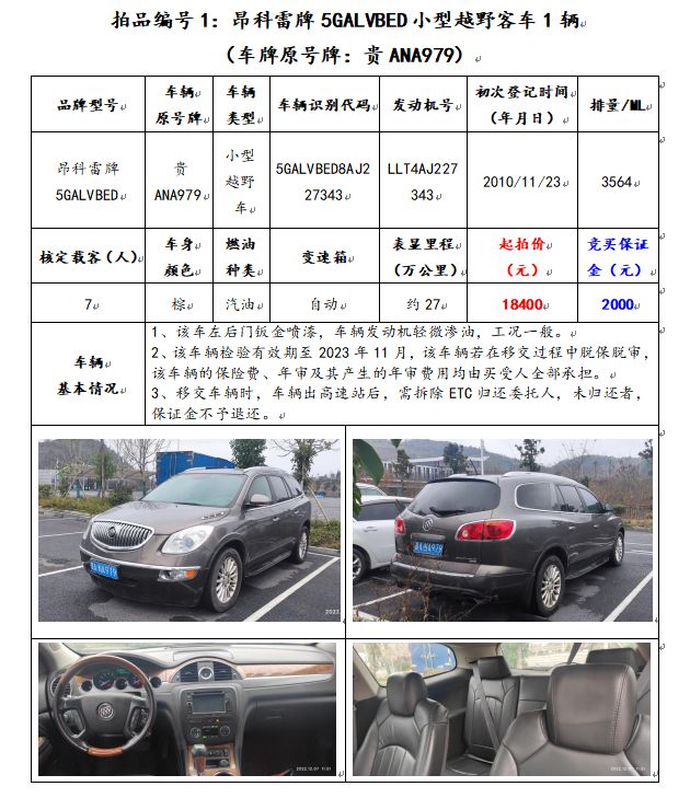 1、昂科雷牌5GALVBED小型越野客車1輛(車牌原號(hào)牌:貴ANA979);