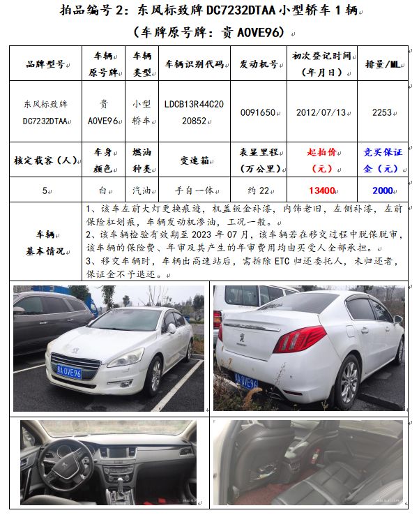 2、東風(fēng)標(biāo)致牌DC7232DTAA小型轎車1輛(車牌原號(hào)牌:貴A0VE96);