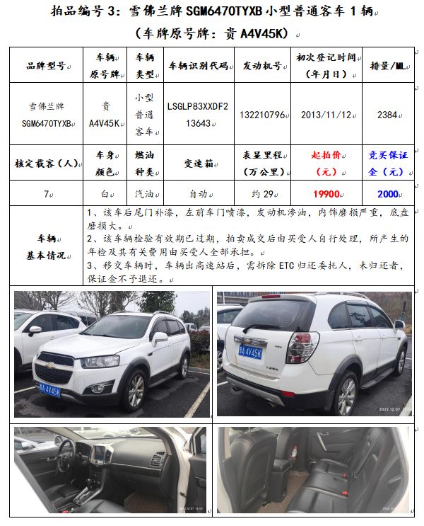 3、雪佛蘭牌SGM6470TYXB小型普通客車1輛(車牌原號(hào)牌:貴A4V45K)。
