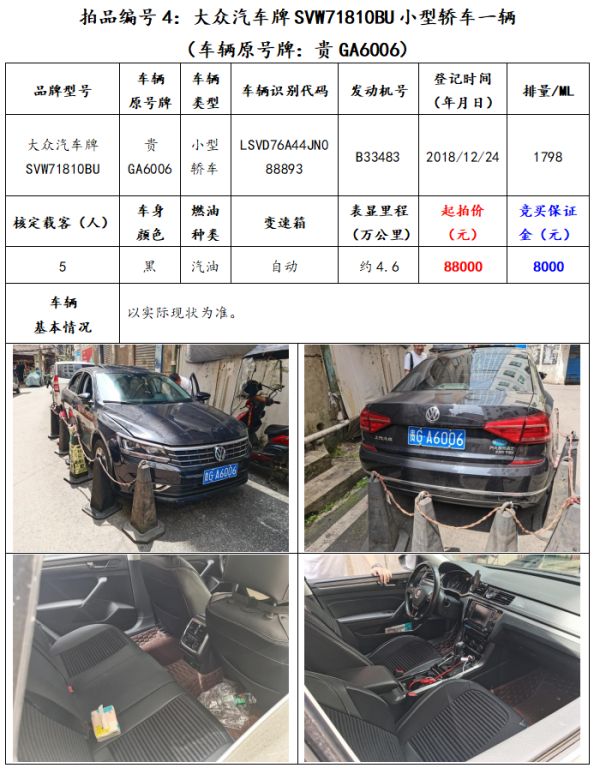 拍品編號(hào)4:大眾汽車牌SVW71810BU小型轎車一輛(車輛原號(hào)牌:貴GA6006)