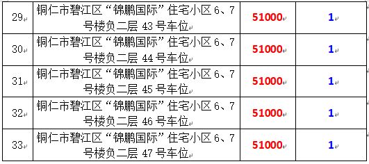 拍品編號(hào)15-33:銅仁市碧江區(qū)“錦鵬國(guó)際”住宅小區(qū)6、7號(hào)樓負(fù)一層:32號(hào)、35號(hào)、53號(hào),負(fù)二層:32號(hào)-47號(hào)共計(jì)19個(gè)車(chē)位