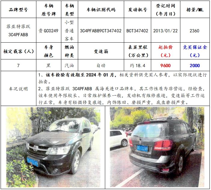 拍品編號(hào)1:菲亞特菲躍3C4PFABB小型普通客車一輛(車輛原號(hào)牌:貴GC0249);