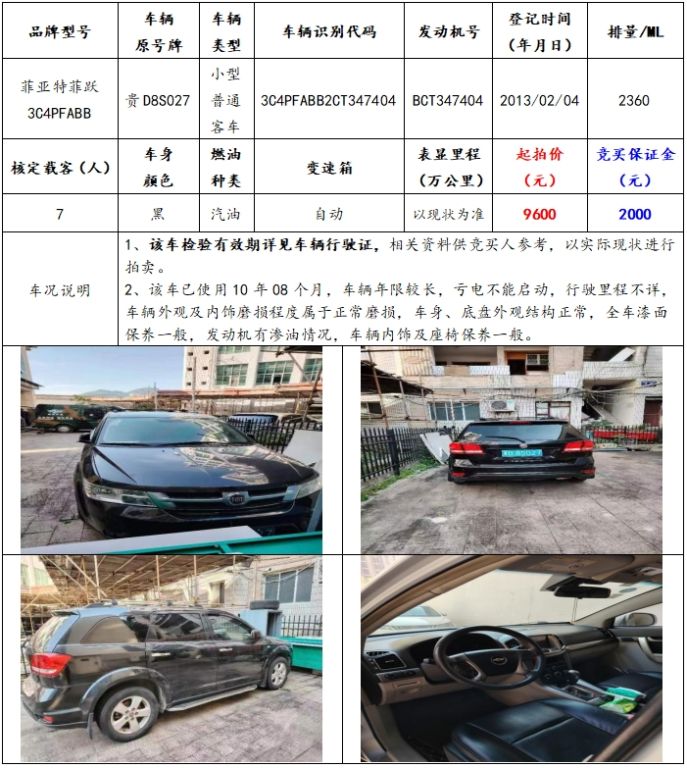 拍品編號(hào)2:菲亞特3C4PFABB小型普通客車一輛(車輛原號(hào)牌:貴D8S027);