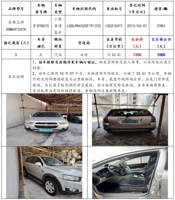 拍品編號(hào)4:雪佛蘭牌SGM6472ATA小型普通客車一輛(車輛原號(hào)牌:貴DT8515);