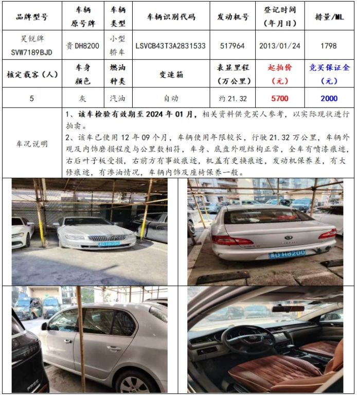 拍品編號(hào)5:昊銳牌SVW7189BJD小型轎車一輛(車輛原號(hào)牌:貴DH8200)。