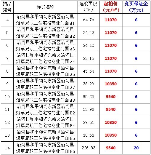 4、沿河縣和平鎮(zhèn)河東新區(qū)沿河縣煙草局職工住宅樓商業(yè)門面11間,建筑面積:34.42-226.83㎡,起拍價:9540元/㎡-11070元/㎡,競買保證金:6萬元/間。