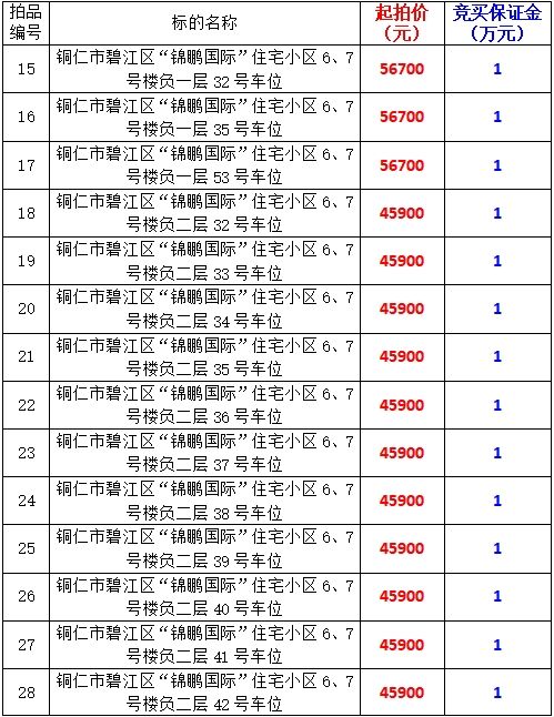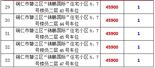 拍品編號15-33:銅仁市碧江區(qū)“錦鵬國際”住宅小區(qū)6、7號樓負一層32號、35號、53號,負二層32號-47號共計19個車位