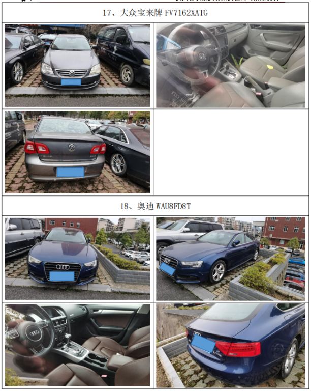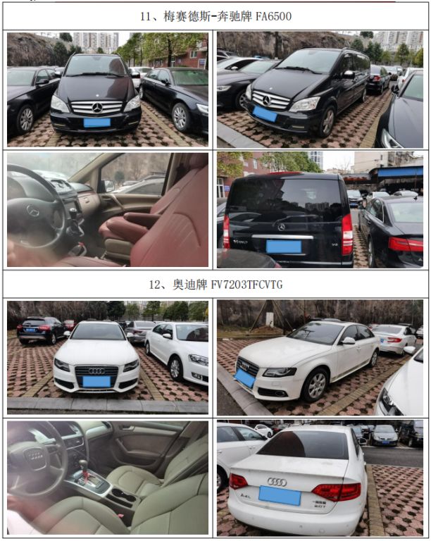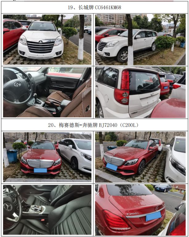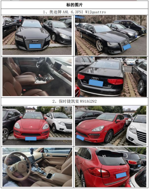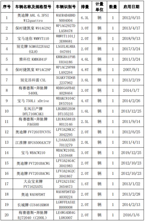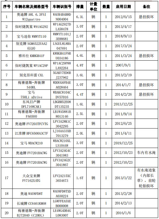 拍品名稱:保時(shí)捷凱宴、寶馬、梅賽德斯-奔馳牌、奧迪、別克、雅科仕、東風(fēng)日產(chǎn)牌、江淮牌、大眾寶來(lái)牌、長(zhǎng)城牌等車輛,共計(jì)20輛(整體拍賣),起拍價(jià):156.8萬(wàn)元,競(jìng)買保證金:20萬(wàn)元: