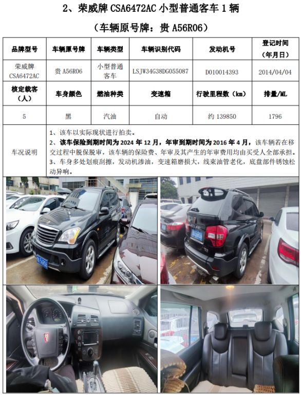 拍品編號4:榮威牌CSA6472AC小型普通客車1輛
