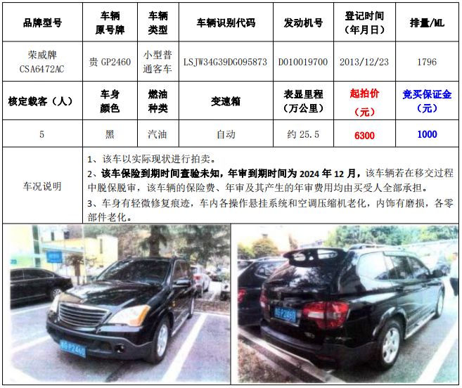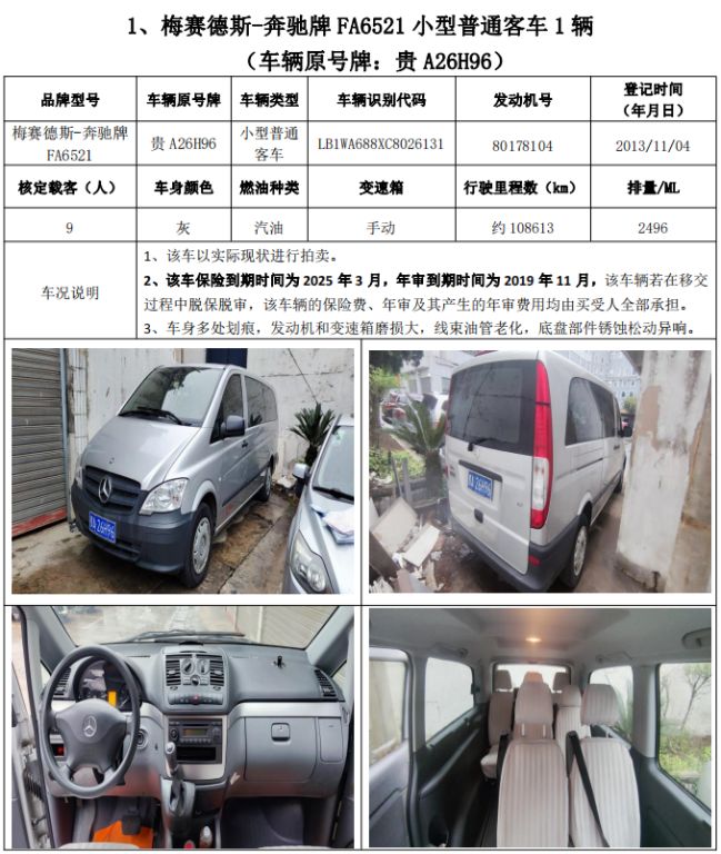 拍品編號1:梅賽德斯-奔馳牌FA6521小型普通客車1輛、榮威牌CSA6472AC小型普通客車1輛,共計2輛(整體拍賣)