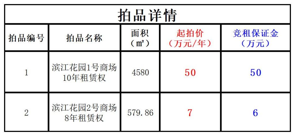 1、濱江花園1號商場10年租賃權(quán),面積:4580㎡,起拍價:50萬元/年,競租保證金:50萬元(自第4年起租金按年租金的3%逐年遞增);