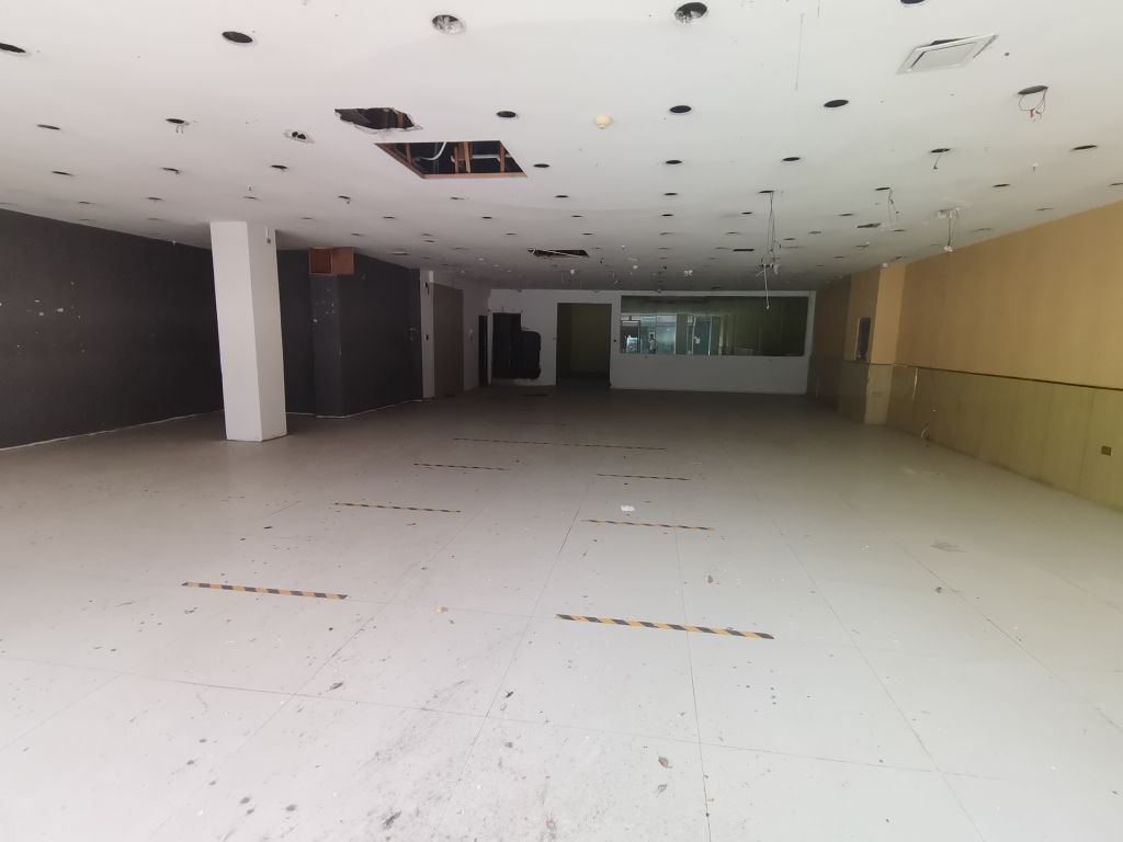 戶(hù)型布局為敞開(kāi)式通間,地面貼地磚,部分墻面貼刮膩?zhàn)臃埏椕?、部分墻面為毛胚,天棚石膏板、磚石板材吊頂。