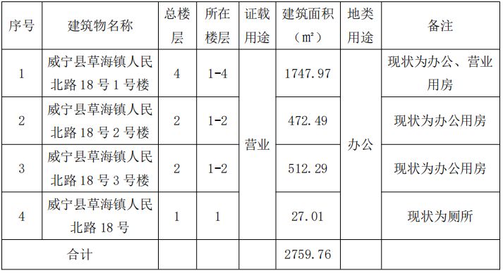 標(biāo)的坐落于威寧縣草海鎮(zhèn)人民北路18號稱為1號樓、2號樓和3號樓的三項(xiàng)房屋,房屋建筑面積為:2759.76㎡,混合結(jié)構(gòu),房屋總層數(shù)為4層,拍賣標(biāo)的所在層數(shù)為1-4層,產(chǎn)權(quán)證號:威房權(quán)證草海鎮(zhèn)字第00007730號,設(shè)計(jì)用途為營業(yè)。土地證號:威國用(2009)第133號,地類(用途):辦公用地,使用權(quán)類型:作價出資,使用權(quán)面積:1854.70㎡。