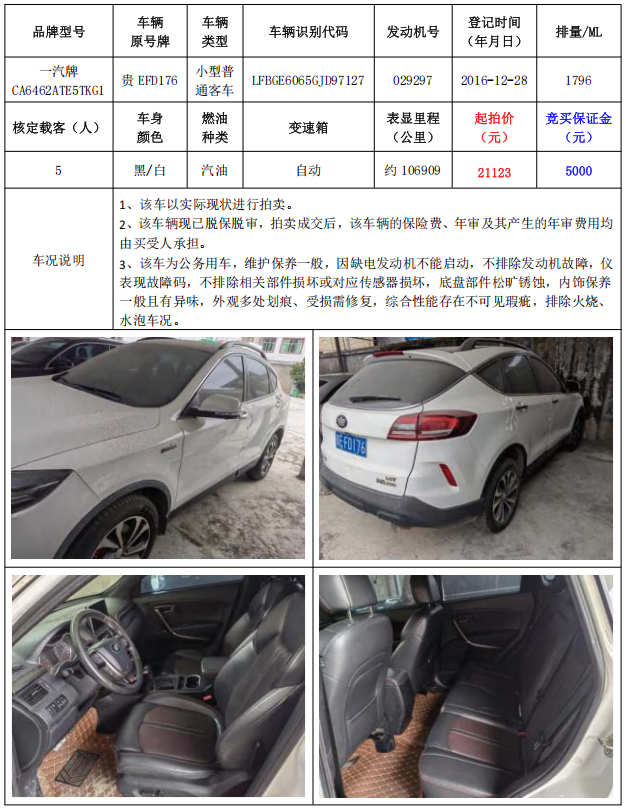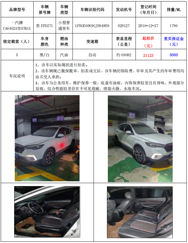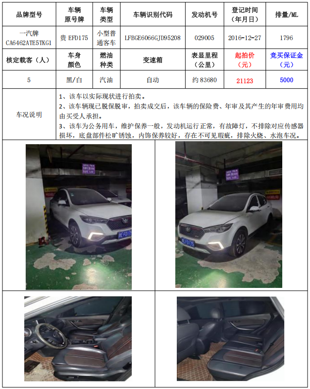 拍品編號1:一汽牌CA6462ATE5TKG1小型普通客車1輛