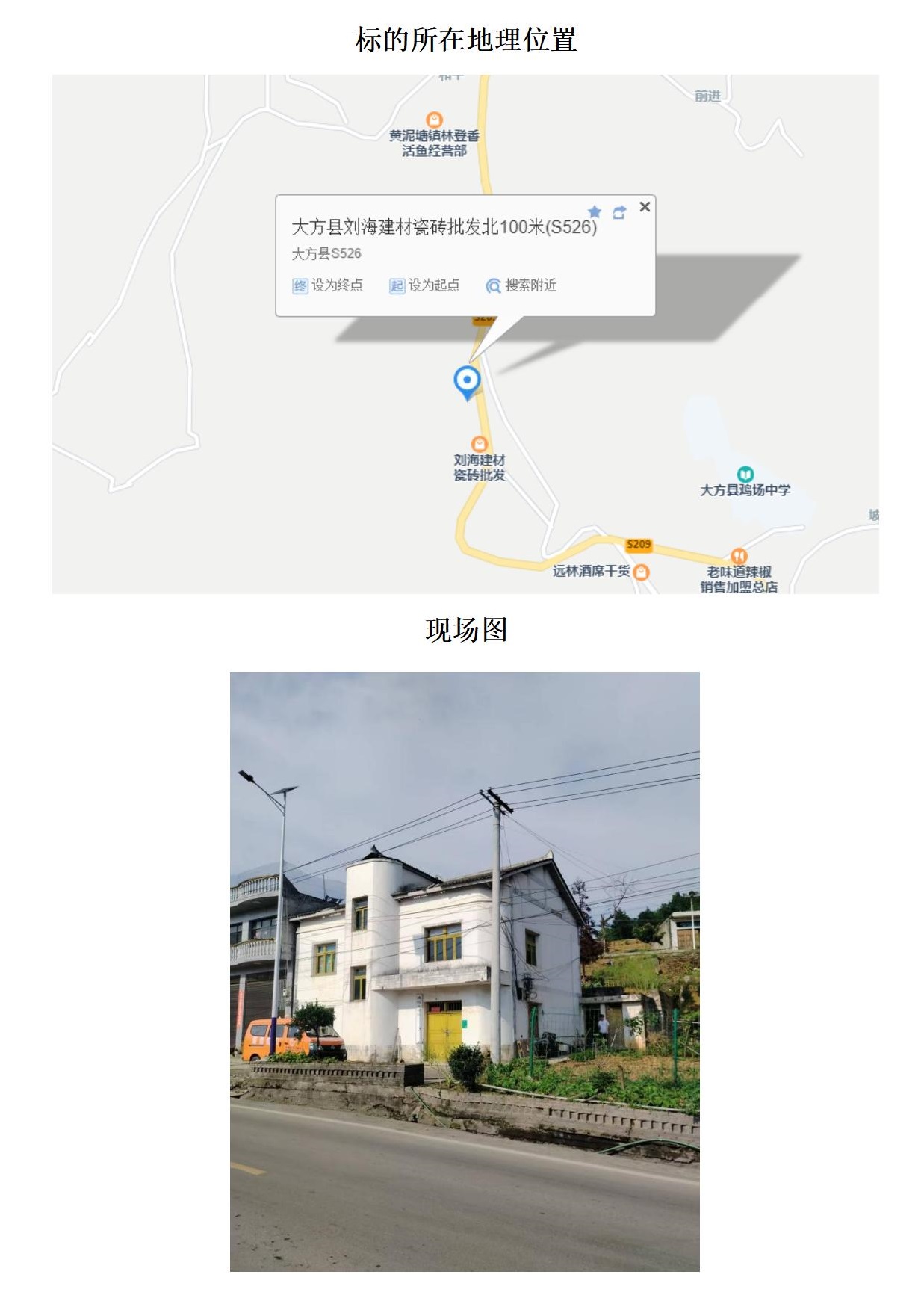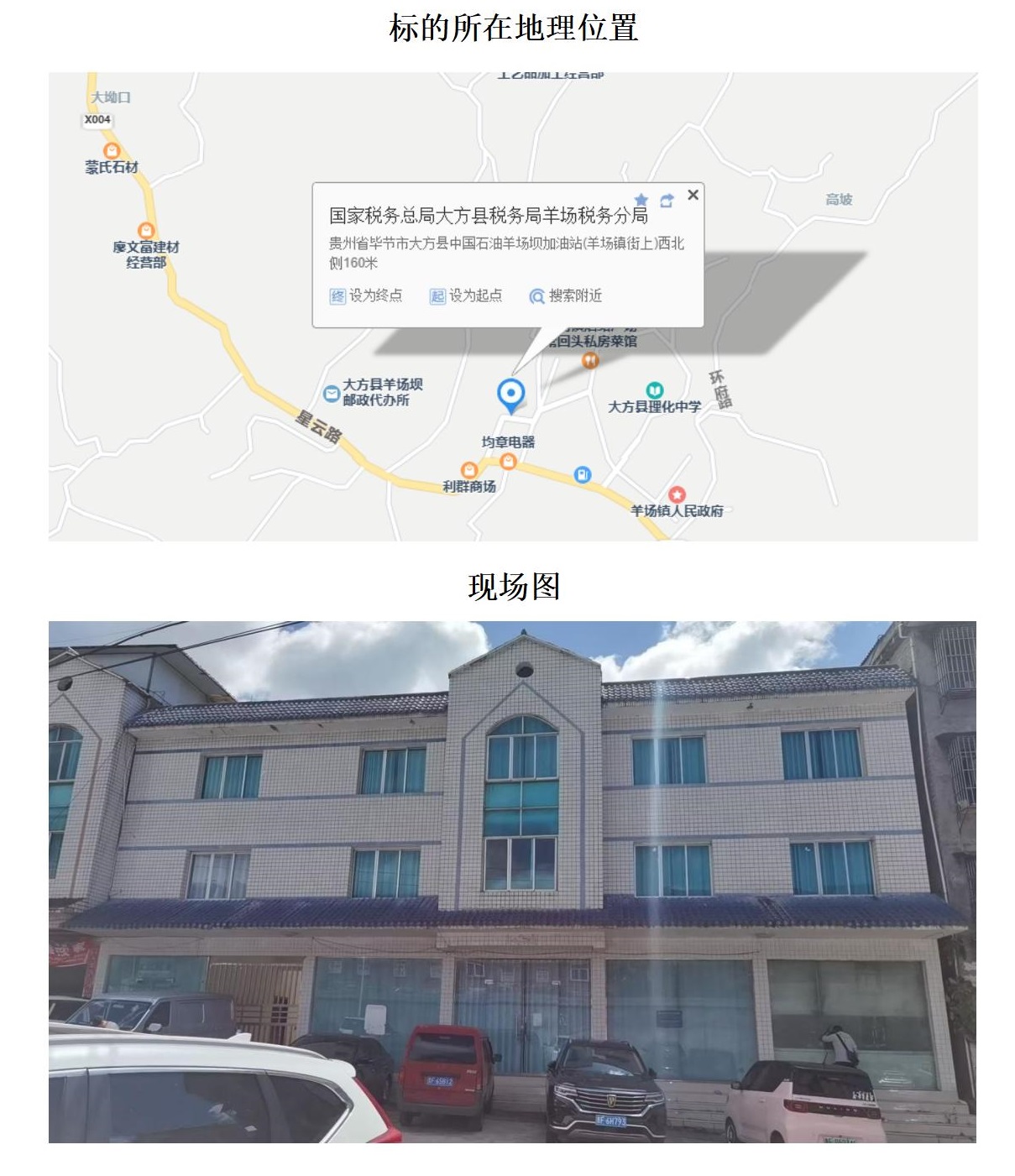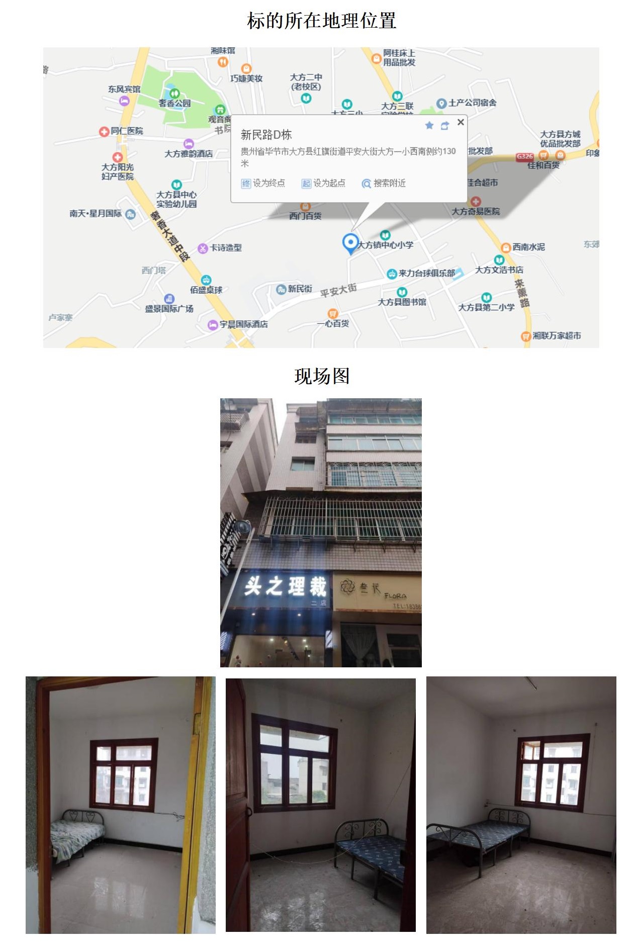 標(biāo)的位于大方縣長石鎮(zhèn)長青小學(xué)。建筑面積:658.09㎡,土地面積:2322.48㎡,建筑結(jié)構(gòu)為混合結(jié)構(gòu),共2棟,總層數(shù)分別為3層和1層,房屋用途為住宅,土地性質(zhì)為劃撥。
