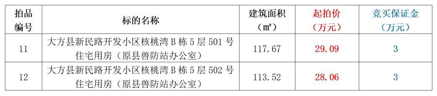 拍品編號11-12:大方縣新民路開發(fā)小區(qū)核桃灣B棟5層501、502號住宅用房(原縣獸防站辦公室)