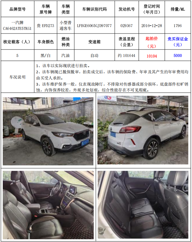 拍品編號3:一汽牌CA6462ATE5TKG1小型普通客車1輛(車輛原號牌:貴EFD273)