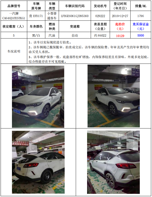 拍品編號1:一汽牌CA6462ATE5TKG1小型普通客車1輛(車輛原號牌:貴EFD271)