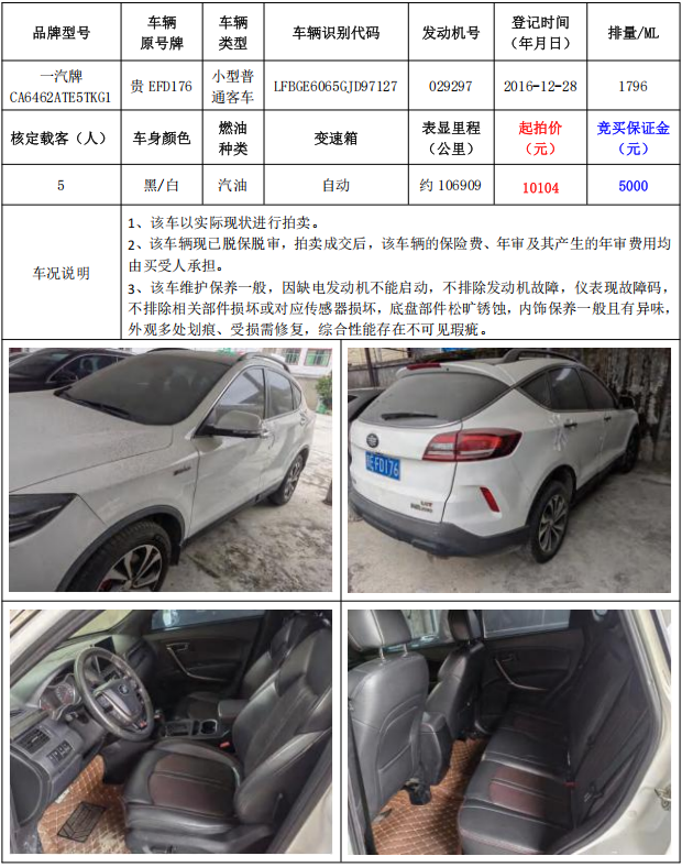 拍品編號5:一汽牌CA6462ATE5TKG1小型普通客車1輛(車輛原號牌:貴EFD176)