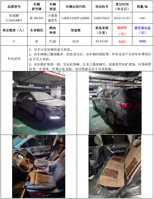 拍品編號6:哈弗牌CC6461RM07小型普通客車1輛(車輛原號牌:貴EM1507)