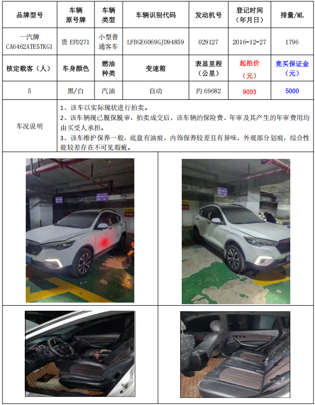 拍品編號(hào)1:一汽牌CA6462ATE5TKG1小型普通客車(chē)1輛(車(chē)輛原號(hào)牌:貴EFD271)