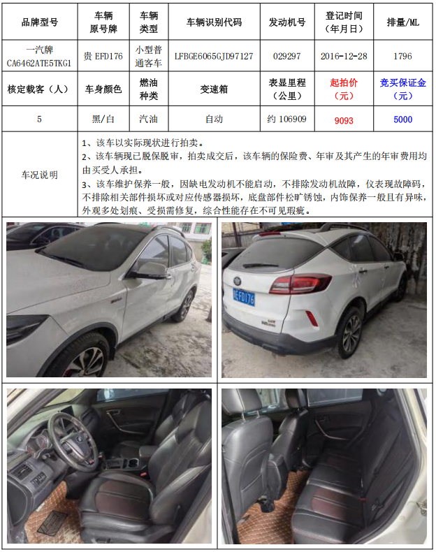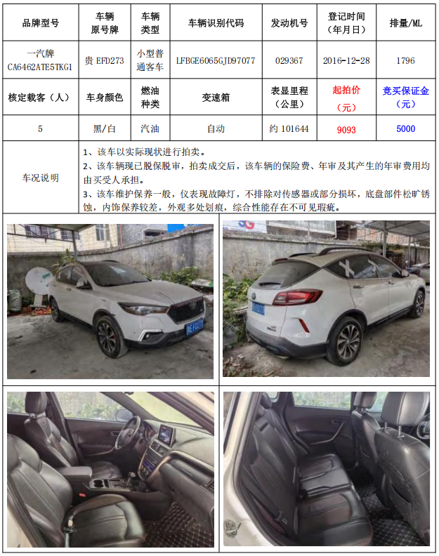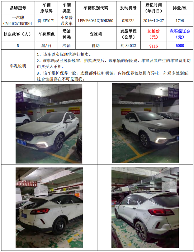 拍品編號(hào)2:一汽牌CA6462ATE5TKG1小型普通客車(chē)1輛車(chē)輛原號(hào)牌:貴EFD175)