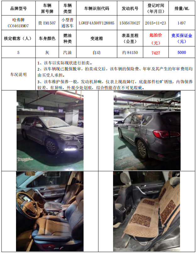 拍品編號(hào)6:哈弗牌CC6461RM07小型普通客車(chē)1輛(車(chē)輛原號(hào)牌:貴EM1507)