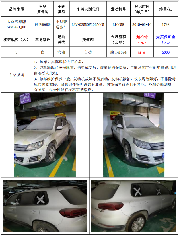拍品編號(hào)7:大眾汽車(chē)牌SVW6451JED小型普通客車(chē)1輛(車(chē)輛原號(hào)牌:貴E90689)