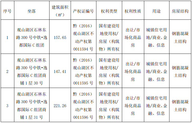 貴陽(yáng)市觀山湖區(qū)石林東路300號(hào)中鐵·逸都國(guó)際C組團(tuán)商鋪、1層30號(hào)商鋪、1層31號(hào)商鋪,共計(jì)3間,建筑面積分別為:157.65㎡、147.41㎡、221.26㎡