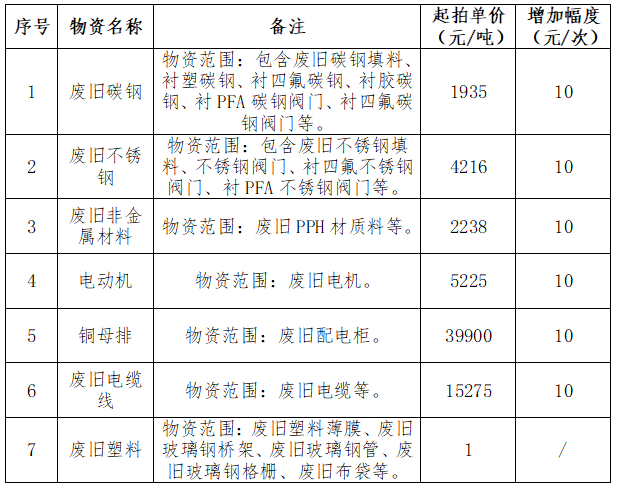 該標(biāo)的為整體拍賣,以序號(hào)1(廢舊碳鋼)起拍單價(jià)1935元/噸進(jìn)行競價(jià),采取增價(jià)方式競拍,每次每噸加價(jià)10元,上不封頂;序號(hào)1(廢舊碳鋼)每增加10元/噸,序號(hào)2-6廢舊物資同步增加10元/噸。序號(hào)7(廢舊塑料)以起拍價(jià)隨附買受,結(jié)算數(shù)量以交付時(shí)實(shí)際過磅數(shù)量為準(zhǔn)。